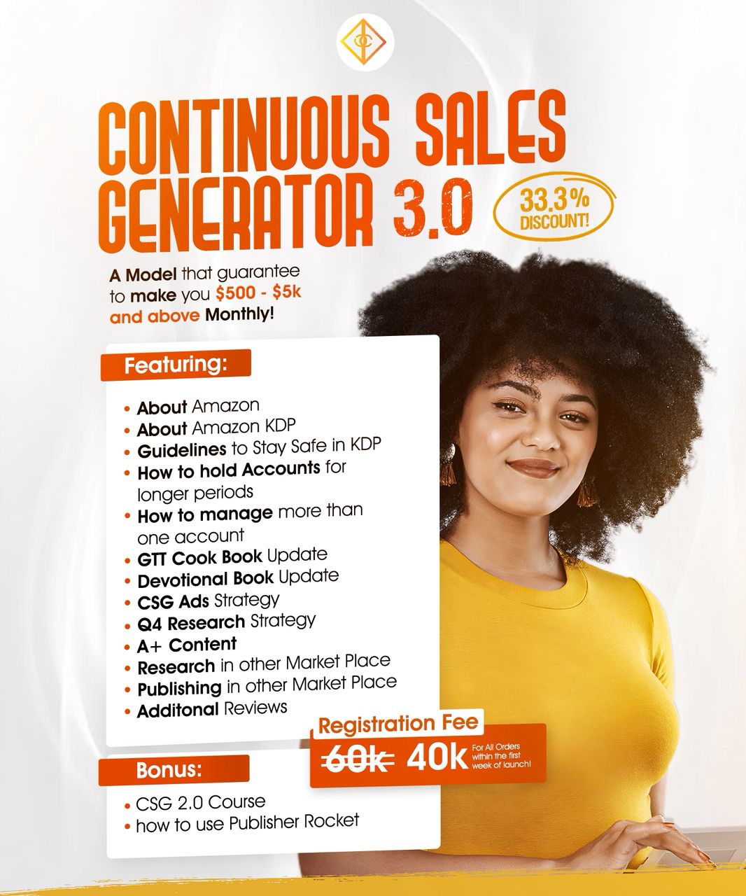 The Continuous Sales Generator (CSG 3.0) is a step-by-step system designed to help self-publishers succeed on Amazon KDP and beyond. Whether you’re a beginner or already selling books, this course equips you with the knowledge to build long-term accounts, manage multiple streams of income, and create books that consistently generate sales.